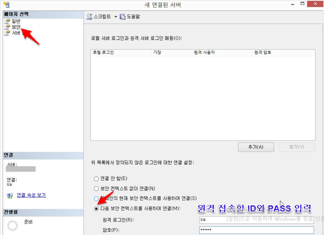3. 새 연결된 서버 -> 보안 -> 다음 보안 컨텍스트를 사용하여 연결 -> 원격접속할 ID와 Password 입력 -> 확인